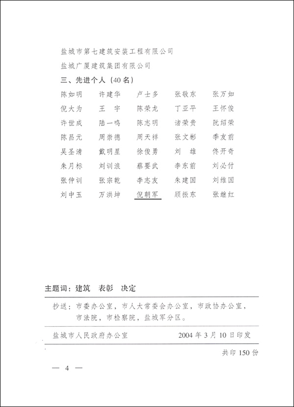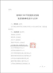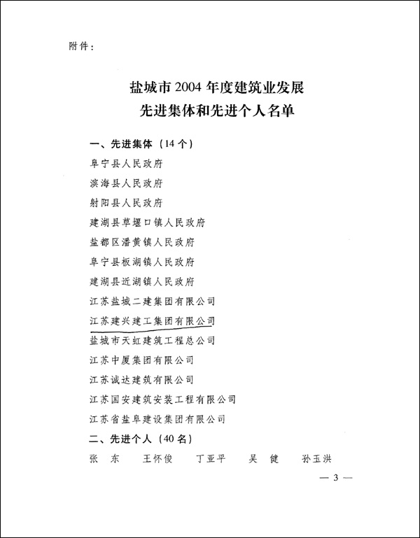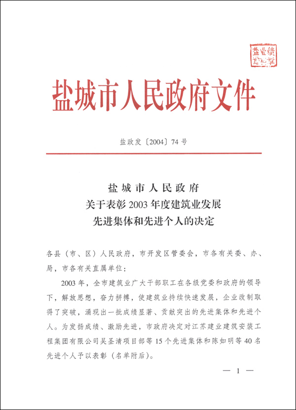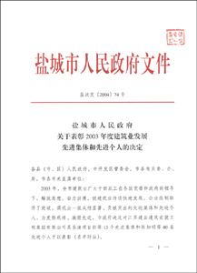 鹽城市人民政府關(guān)于表彰2004年建筑業(yè)發(fā)展先進(jìn)集體和先進(jìn)個(gè)人的決定